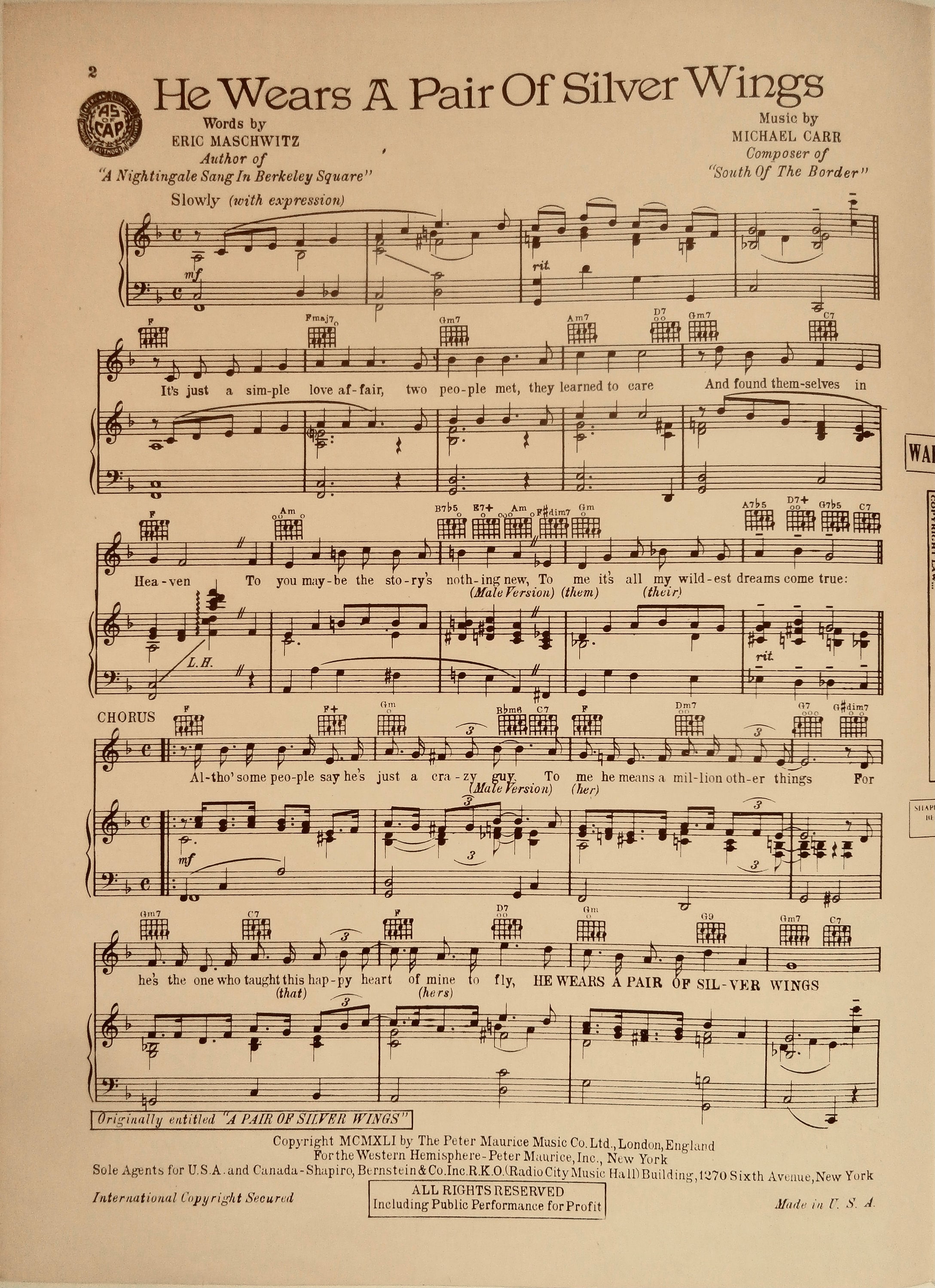He Wears A Pair Of Silver Wings 1941 Kate Smith Eric Maschwitz Michael Carr Sheet Music