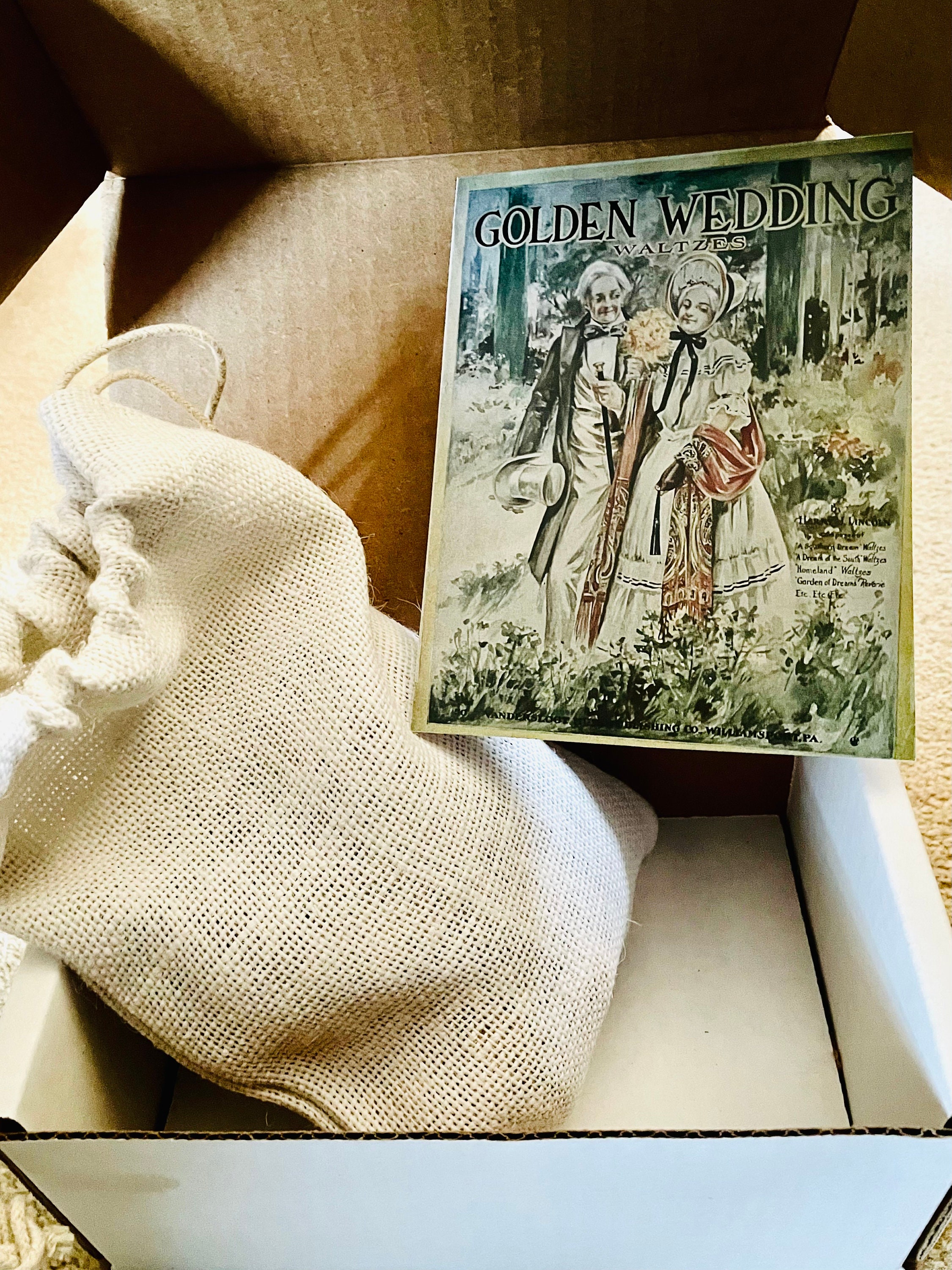 It is packaged in a cloth bag, suitable for gift giving, and includes a print of the original sheet music. Also appropriate for a 50th wedding anniversary.
