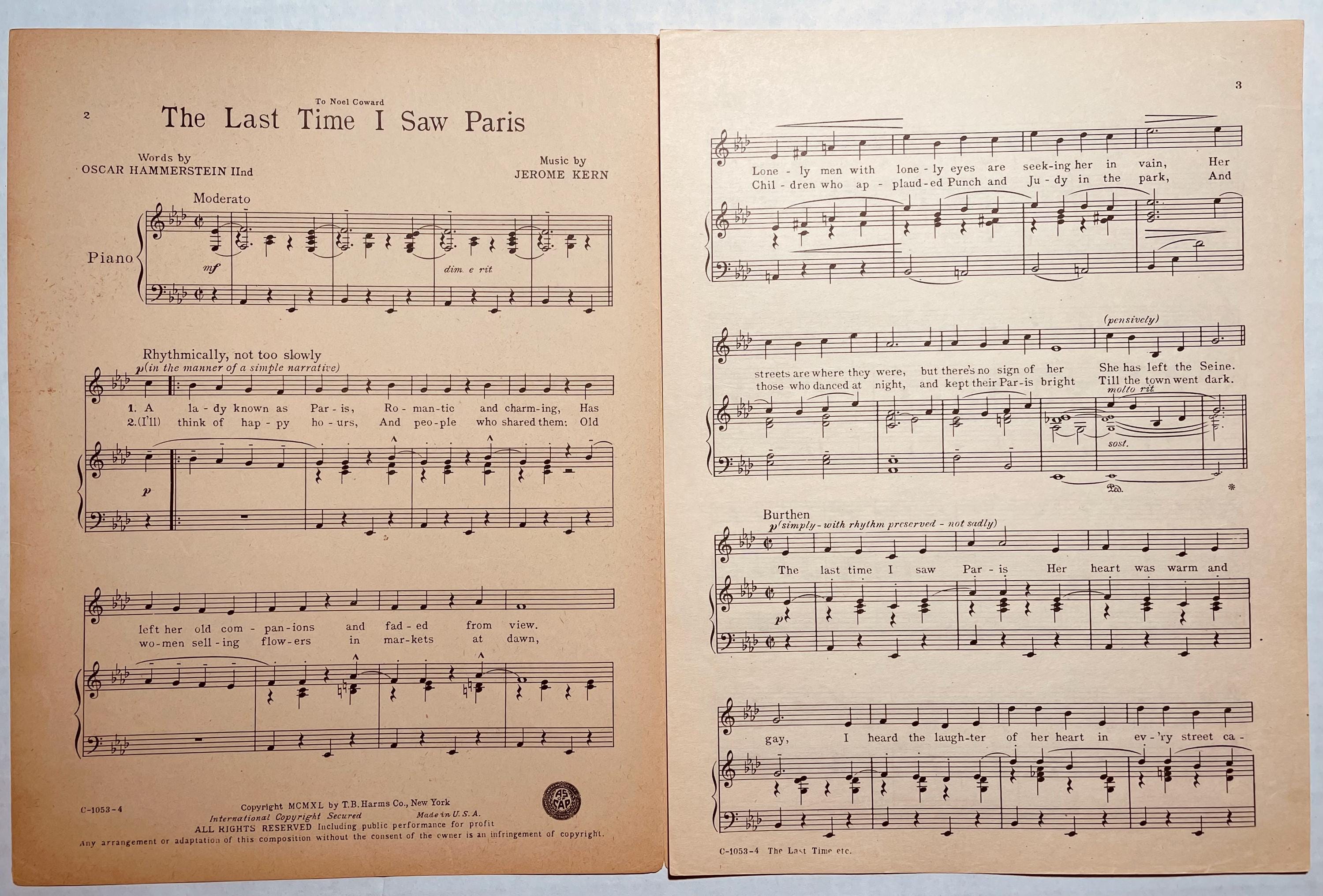 Last Time I Saw Paris, The 1940 Movie Actors - Hildegard Jarome Kern Oscar Hammerstein 2nd Sheet Music