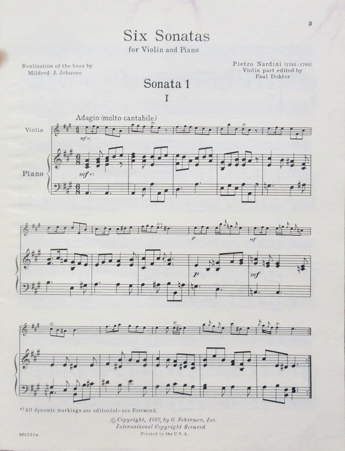 NARDINI Six Sonatas For Violin and Piano Schirmer's Library Vol.1852